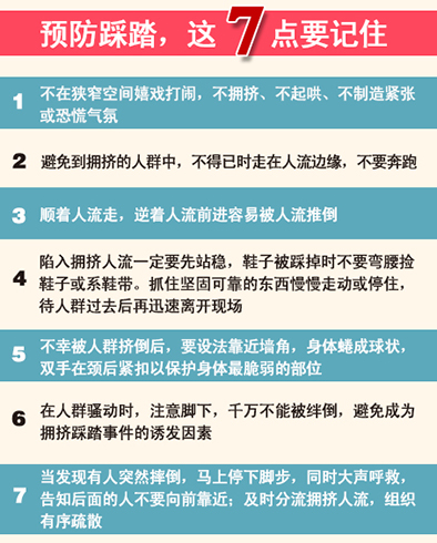 预警 岁末年初,正是返乡探亲、出门旅游的时间,各地人流量都比较大,容易出现拥挤踩踏等事故。2014年12月31日23时35分,上海市黄埔区外滩在群众自发进行的迎新年活动中发生拥挤“踩踏事件”,造成36人死亡。回顾2014年,全球这样的重大踩踏事故还有:2014年7月29日,几内亚首都科纳克里附近一处海滩举行的一场音乐会上发生踩踏事件,造成至少34人死亡,数十人受伤;2014年10月3日,印度北部比哈尔邦省会巴特那3日晚发生严重踩踏事故,事故造成32人死亡,多人受伤……由此可见,岁末年初,出门在外,一定要多个心眼。 攻略 |