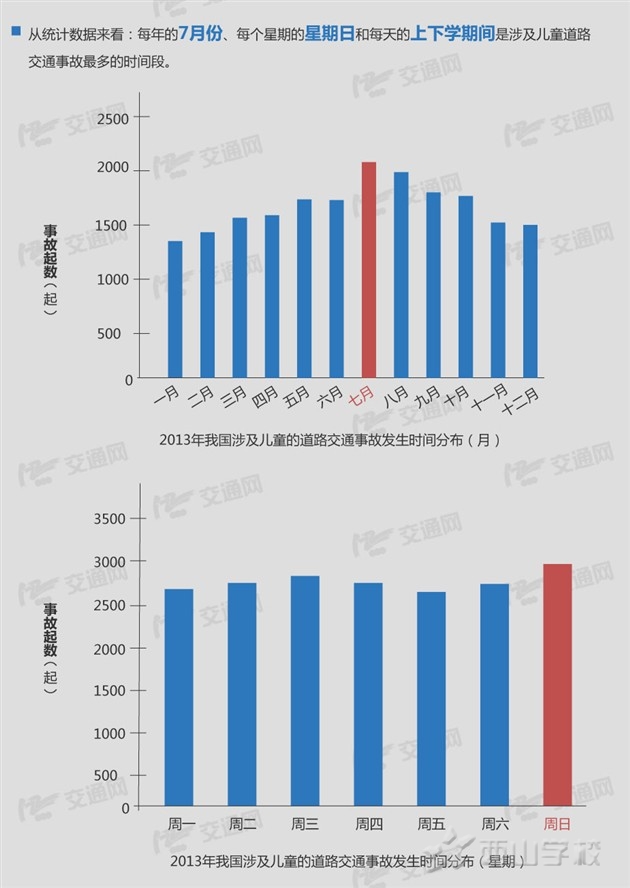 特别提示:暑假期间,家长开车带孩子出行以及孩子自行外出的情况增多,由于疏忽或者照顾不到位,极易导致儿童事故的发生;周末作为固定休息日,很多孩子会自行或者和小伙伴出去玩耍,此时孩子的安全防范意识比较低,容易发生交通事故;每天上下学期间通常也是交通出行的早晚高峰期,道路上车辆增多,也会导致事故高发。