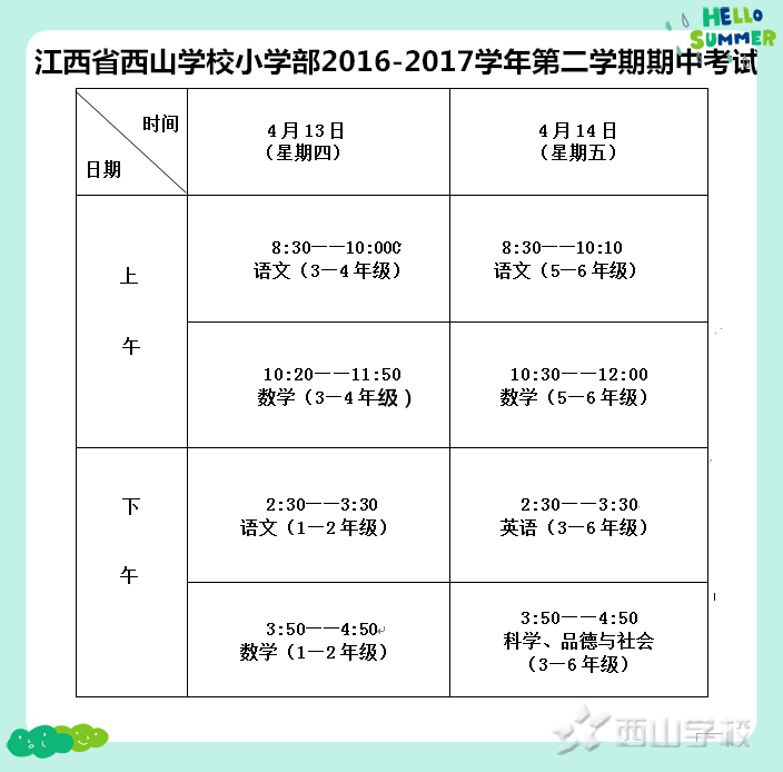 江西省西山学校小学部2016-2017学年第二学期期中考试时间通知