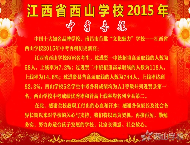 江西省西山学校806名考生,过进贤一中统招重高录取线的人数为58人,上线率为7.2%;过进贤二中统招重高录取线的人数为118人,上线率为14.6%;过进贤县普高录取线的人数为744人,上线率达到92.3%,西山学校5名学生中考各科成绩均为A1等级并列进贤县第一名。西山学校中考成绩优秀率和普高上线率均名列全县第二。