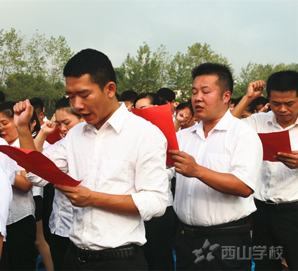 全体教师高举右手,在国旗下庄严宣誓:忠诚党的教育事业,认真履行教书育人的神圣职责,用人格引领人格、用爱心换起爱心,视学生如子女、如弟妹,以民主、平等的态度对待每一位学生,呵护生命、尊重个性,为学生实现理想铺路,做学生爱戴的师长和真诚的朋友,让每一位孩子都得到关爱、让每一位学生都充分发展、让每一位家长都收获希望,为西山学校的腾飞添砖加瓦,为中华民族的复兴奋勇拼搏,贡献全部智慧和力量。