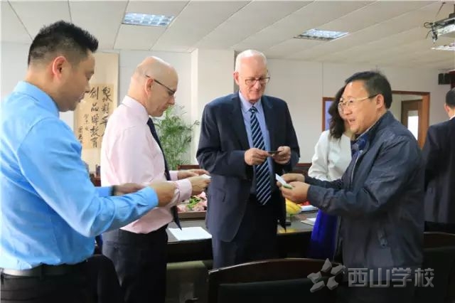 西山学校刘在远校长(右一)与英国国王伍德学校主席、Mr Westbrook(右二)、英国国王伍德学校校长Mr. Morris(左二)互换名片