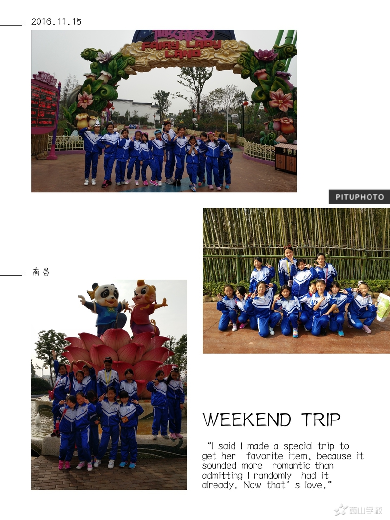 为了拓展学生视野和丰富课余生活,提高学生社会实践能力和社会适应力,让学生感受生活的美好。江西省西山学校小学部在2016年11月15、17日,组织一至六年级部分学生到南昌万达乐园开展秋游活动。
