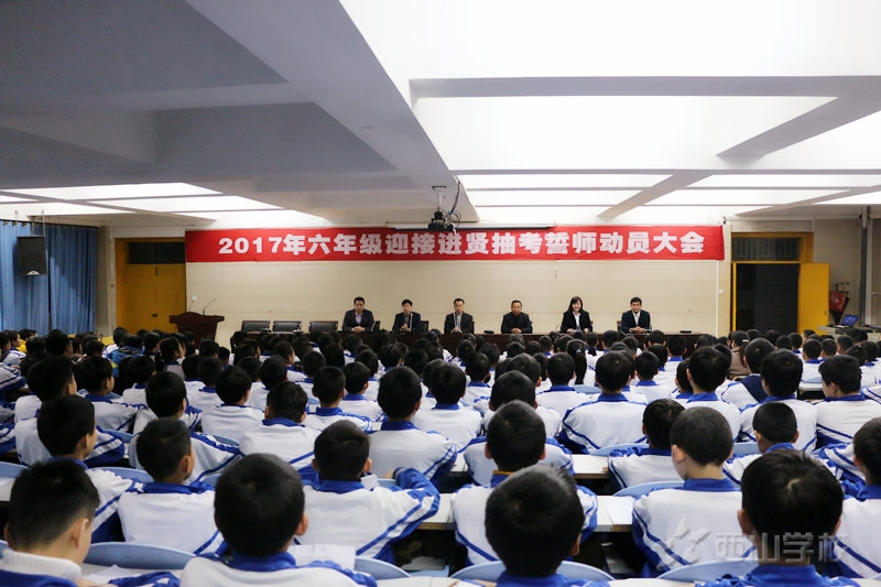 为进一步激发六年级学生的学习热情,增强六年级学生学习的责任心和使命感,营造考前进取向上的学习氛围。 2017年3月14日晚,在距离六年级迎接进贤县抽考倒计时100天之际,江西省西山学校小学部六年级在大多媒体室举行2017年迎接进贤县抽考誓师动员大会。小学部校长魏戌军、副校长李俏坡、政教处主任李剑辉、教务处主任吴仍辉以及六年级所有师生参加了誓师动员大会,会议由六年级段长张延花主持。