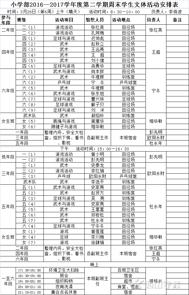 会上,政教处主任李剑辉首先讲到,以后每周三晚上确定为制定周末文体活动方案时间。其次就周末文体活动方案的具体要求做了说明: 1、兵兵球馆和综合训练馆必须安排一个班级活动;2、室外活动要尽量多安排游戏,游戏活动要合理搭配;3、雨天时可以开展丰富多彩的室内活动;4、在检查时,负责人要做好相关记录,有问题做到及时反馈。