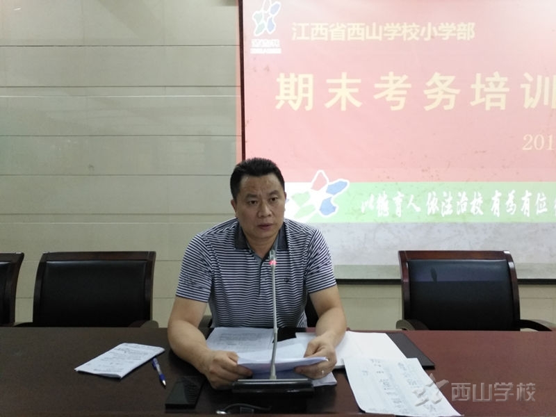 为加强对考试的管理,严肃考场纪律,端正考风和学风,营造一个公平竞争的环境,确保本学期期末考试顺利进行。2017年6月27日晚,江西省西山学校小学部在大多媒体召开了期末考务培训会,小学部政教主任李剑辉、教务主任吴仍辉以及全体文化教师参加培训会。