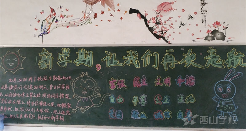 告别夏季的炎热,迎来秋高气爽的九月。新的学期,新的开始,新的征程。江西省西山学校小学部的教师们在开学初期,为了营造良好的学习气氛,培养学生爱国情怀,各班绘制了一期精彩的黑板报,着重体现安全文明校园以及社会主义核心价值观。