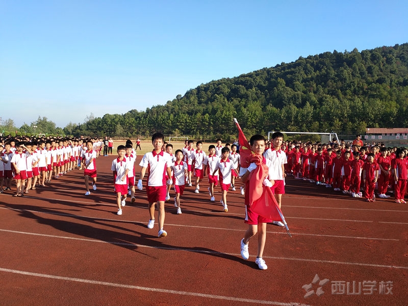 迎着朝阳,六(3)班国旗护卫队员们迈着铿锵的步伐来到国旗下,全场一片肃静,全体师生向国旗行礼。在激昂的《义勇军进行曲》中,升旗手振臂一挥,鲜艳的五星红旗徐徐展开,在初升阳光的映照下冉冉升起,鲜艳的五星红旗飘扬在西山的上空。
